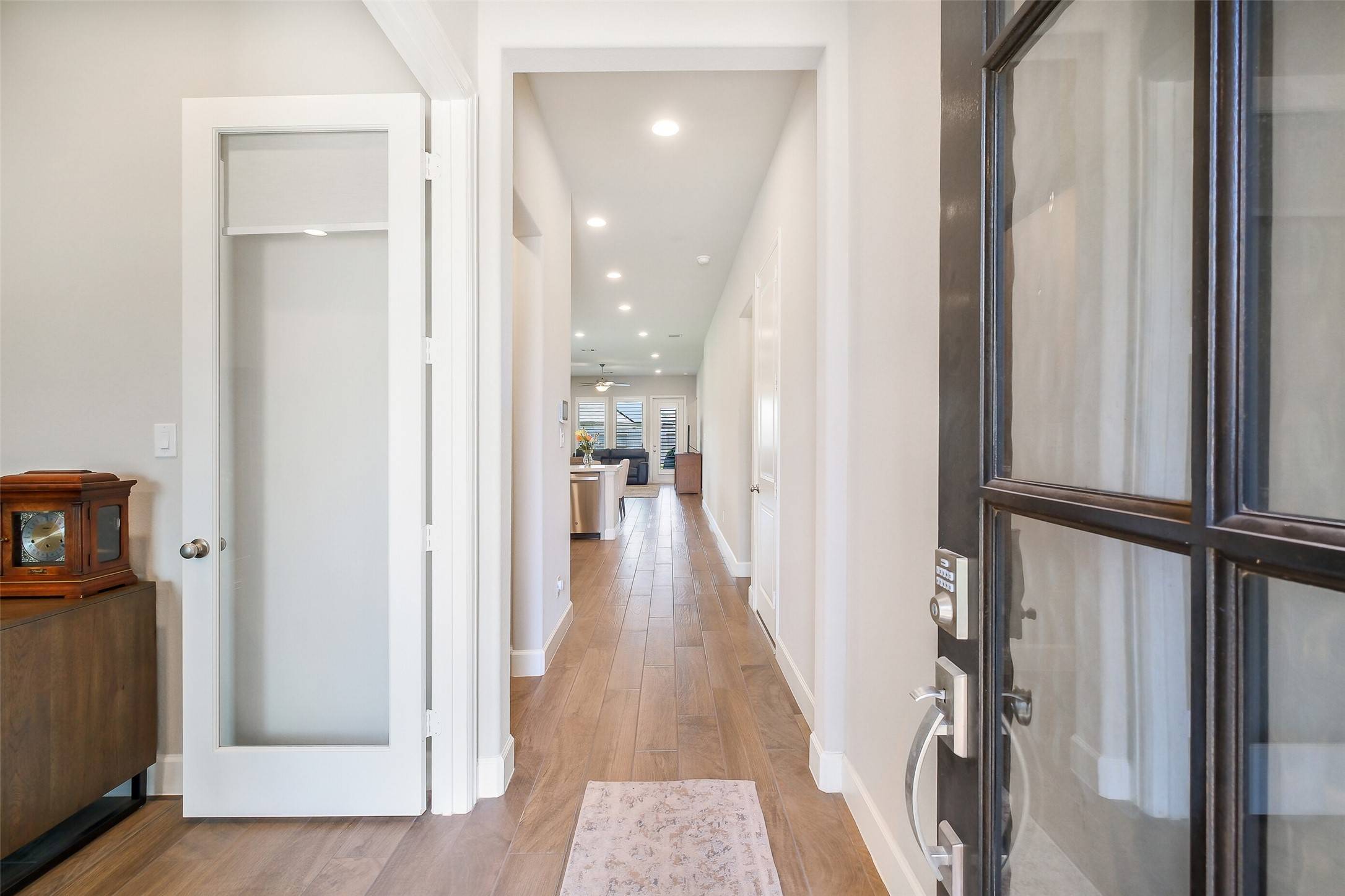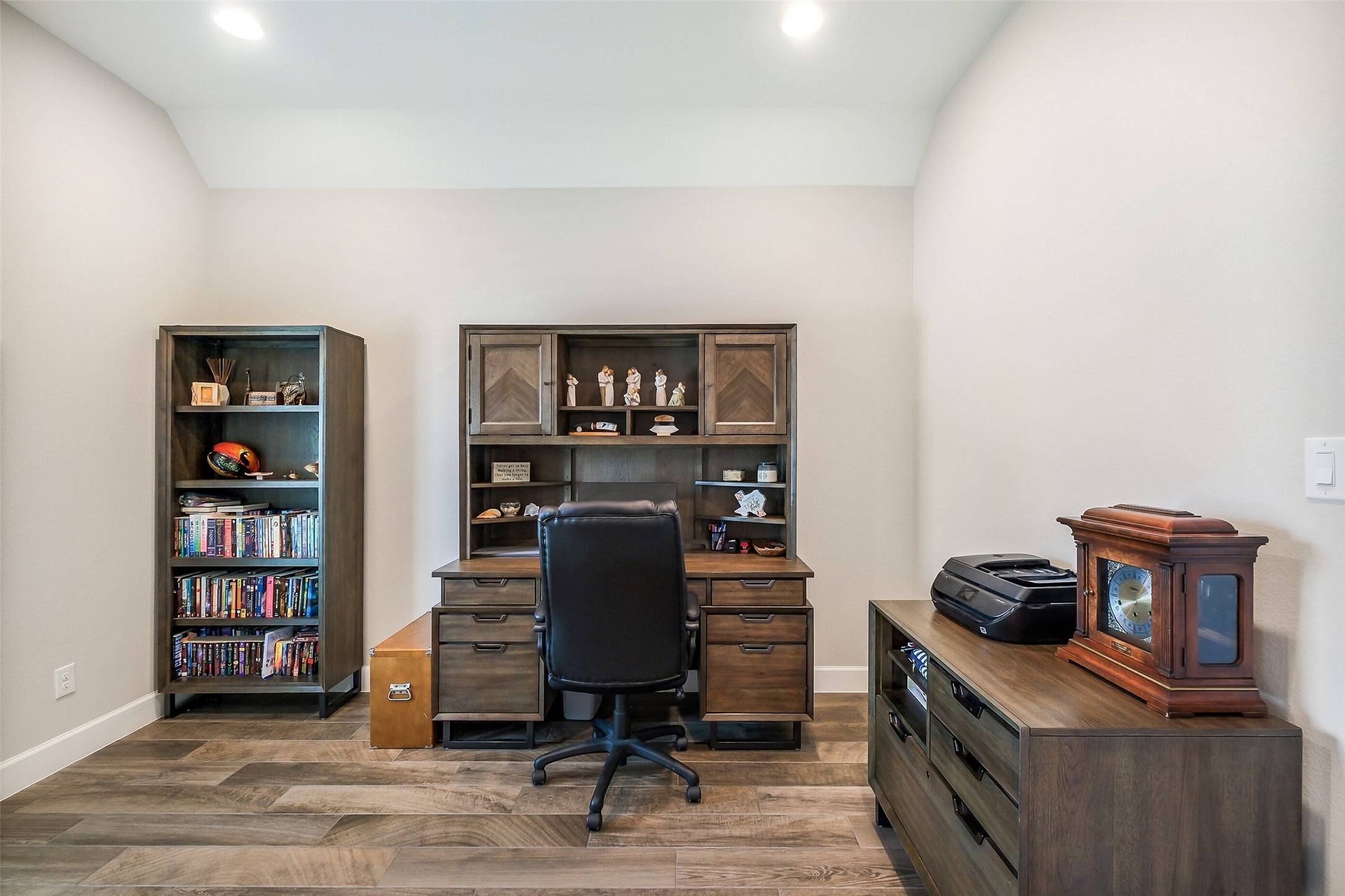 Beautiful home situated on an oversized lot in the premier master-planned community of Elyson. This one story by Perry Homes features a well-appointed design w/open-concept living, 4 bedrooms, 2 full baths & a dedicated home office. The gourmet kitchen boasts a center island, shaker-style cabinetry, quartz countertops, stainless steel appliances (fridge included!) & a walk-in pantry, and it flows seamlessly into the dining & family rooms. The spacious primary suite is tucked away at the back of the home. Walk-in closets in all bedrooms. Outside, enjoy the covered patio that overlooks the expansive backyard. Notable features & upgrades: Generac generator, custom shutters in all common areas & the primary bedroom, 10 ft ceilings, wood-look tile flooring, overhead garage storage, attic flooring for additional storage space, water softener. Walking distance to the Lakeside Landing amenity center that includes a resort-style pool, lap pool, splash pad, fitness center, splash pad & more.